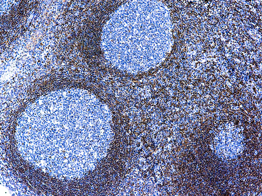 The Bcl-2 product is considered to act as an inhibitor of apoptosis. Bcl-2 expression is inhibited in germinal centers where apoptosis forms part of the B cell production pathway. Reactive follicles show no staining for Bcl-2, whereas the cell in neoplastic follicles exhibit membrane staining. Bcl-2 α oncoprotein has been shown to inhibit apoptosis.