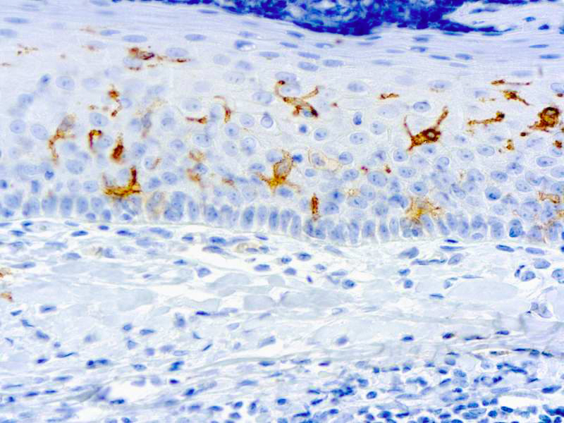 At least five CD1 genes (CD1a, b, c, d, and e) are identified. Cd1 proteins have been demonstrated to restrict T cell response to non-peptide lipid and glycolipid antigens and play a role in non-classical antigen presentation. CD1a is a non-polymorphic MHC Class I related cell surface glycoprotein, expressed in association with Beta-2 microglobulin. Anti-CD1a labels Langerhans cell histiocytosis (Histiocytosis X), extranodal histiocytic sarcoma, a subset of T-lymphoblastic lymphoma/leukemia, and interdigitating dendritic cell sarcoma of the lymph node. When combined with antibodies against TTF-1 and CD5, anti-CD1 is useful in distinguishing between pulmonary and thymic neoplasms since CD1a is consistently expressed in thymic lymphocytes in both typical and atypical thymomas, but only focally in 1/6 of thymic carcinomas and not in lymphocytes in pulmonary neoplasms. Anti-CD1a is reported to be a new marker for perivascular epithelial cell tumor (PEComa).