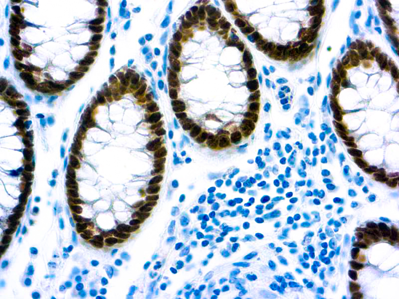 The caudal-related homeodomain protein 2, CDX-2, is a transcription factor which is expressed in the intestine and is thought to play an important role in the proliferation and differentiation of intestinal epithelial cells. The CDX2 protein is expressed in primary and metastatic colorectal carcinomas, intestinal metaplasia of the stomach and intestinal type gastric cancer. In human colorectal cancer, the expression of both CDX2 and carbonic anhydrase 1, a gene regulated by CDX2, is reduced or absent. CDX-2 is one of the important regulators in defining pathways for coordinate control of drug metabolism in the gastrointestinal tract.