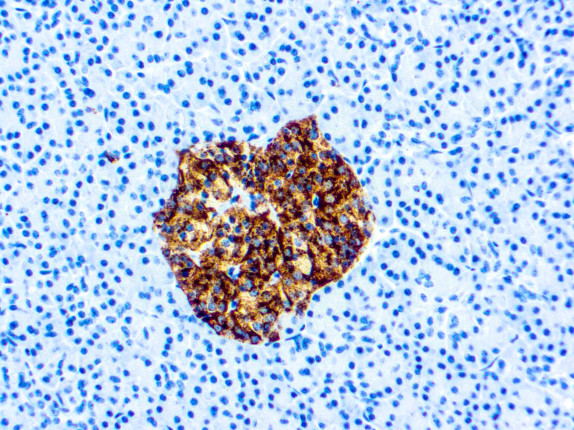 This antibody recognizes Chromogranin A. Chromogranin A (a protein of 439 amino acid which is encoded on chromosome 14) is present in neuroendocrine cells throughout the body, including the neuroendocrine cells of the large and small intestine, adrenal medulla and pancreatic islets. It is an excellent marker for carcinoid tumors, pheochromocytomas, paragangliomas, and other neuroendocrine tumors. Coexpression of chromogranin A and neuron specific enolase (NSE) is common in neuroendocrine neoplasms.