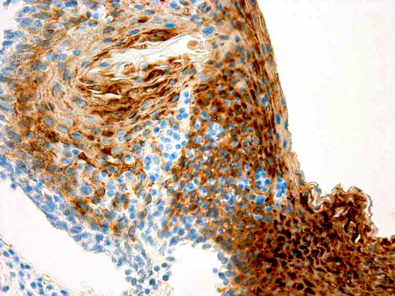 This antibody is specific to 54 kDa protein. Cytokeratin 13 belongs to the type A (acidic) subfamily of low molecular weight cytokeratins and exists in combination with cytokeratin 4. Cytokeratin 13 is expressed in squamous, non-keratinized epithelium, transitional epithelium and myoepithelium. This antibody is useful for the identification of carcinomas of trachea, sweat glands, bladder, ectocervix, tongue, esophagus, anal canal and the basal layer of keratinized epidermis.