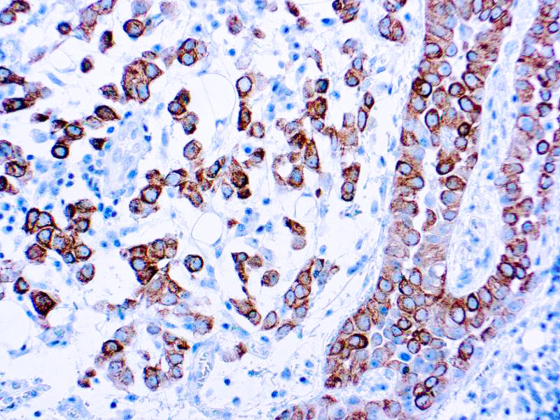 This antibody reacts with cytokeratin 5 intermediate filament protein. Basal cells of human epidermis express acidic cytokeratin 14 and basic cytokeratin 5. Cytokeratin 5 is a 58 kDa protein, which is closely related to cytokeratin 6. Cytokeratin 5 and 6 are expressed in basal cell epithelioma, basal cells of prostate, urothelium, vagina, squamous cell carcinomas of skin, tongue, epiglottis and rectal-anal region. Cytokeratin 5 can be useful in the distinction of mesotheliomas from most adenocarcinomas.