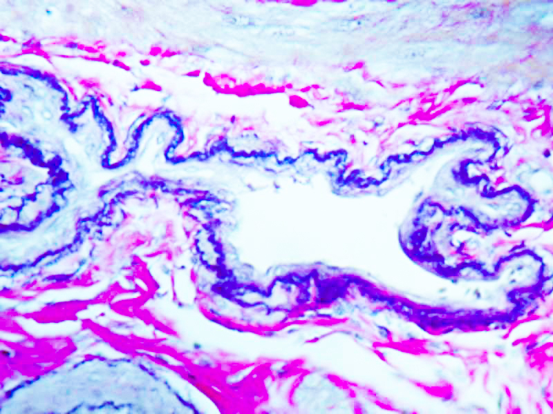 The Elastic Stain Kit (Modified Verhoff’s) is intended for use in histological demonstration of elastin in tissue sections. Demonstration of elastic tissue is useful in cases of emphysema (atrophy of elastic tissue), arteriosclerosis (thinning and loss of elastic fibers) and various other vascular diseases.
