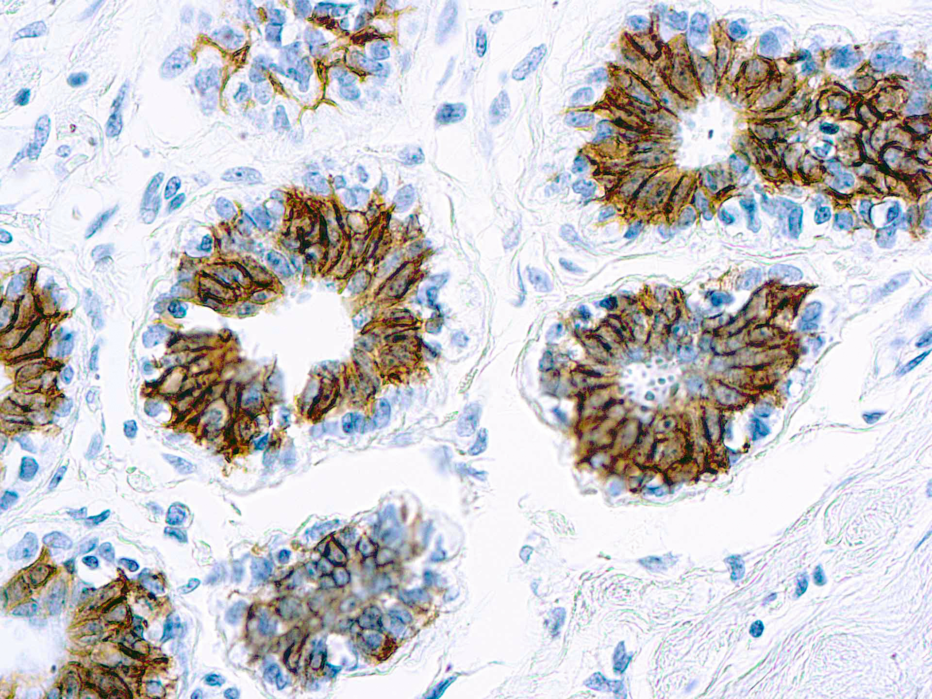 Epithelial antigen is a cell surface glycoprotein and is broadly distributed in epithelial cells and displays a highly conserved expression in carcinomas. Epithelial antigen has been shown to play an important role as a tumor cell marker in lymph nodes from patients with esophageal carcinoma. Epithelial antigen can be used to distinguish between basal cell and basosquamous carcinomas and squamous cell carcinoma of the skin.