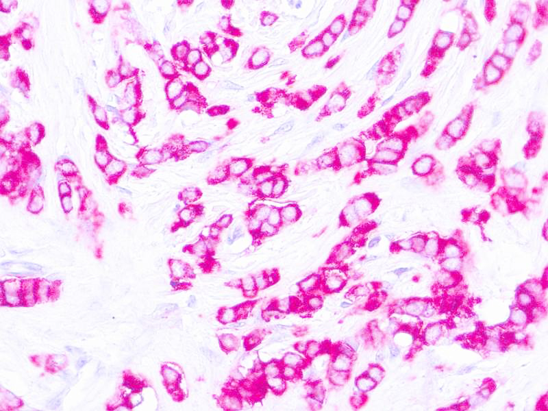 This antibody reacts with an antigen of 265‐400 kDa belonging to a heterogeneous group of heavily glycosylated proteins called human milk fat globule proteins. It stains both normal and neoplastic cells. Among normal epithelia, it reacts strongly with mammary epithelium and glandular epithelia but shows a patchy staining with squamous epithelium.