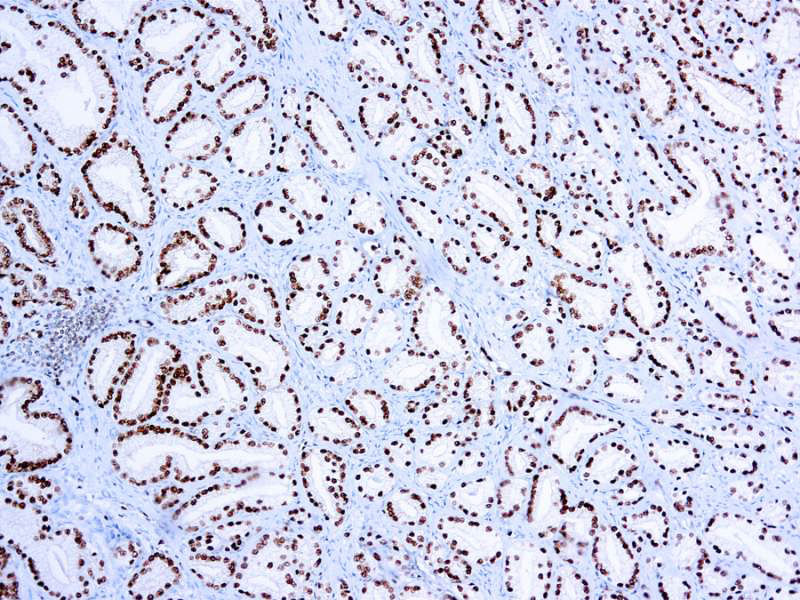 ERG, the ETS related gene, belongs to the ETS family that plays important roles in cell development, differentiation, proliferation, apoptosis and tissue remodeling. The ERG antibody identifies endothelial cells, lymphocytes and prostate cancer cells.
