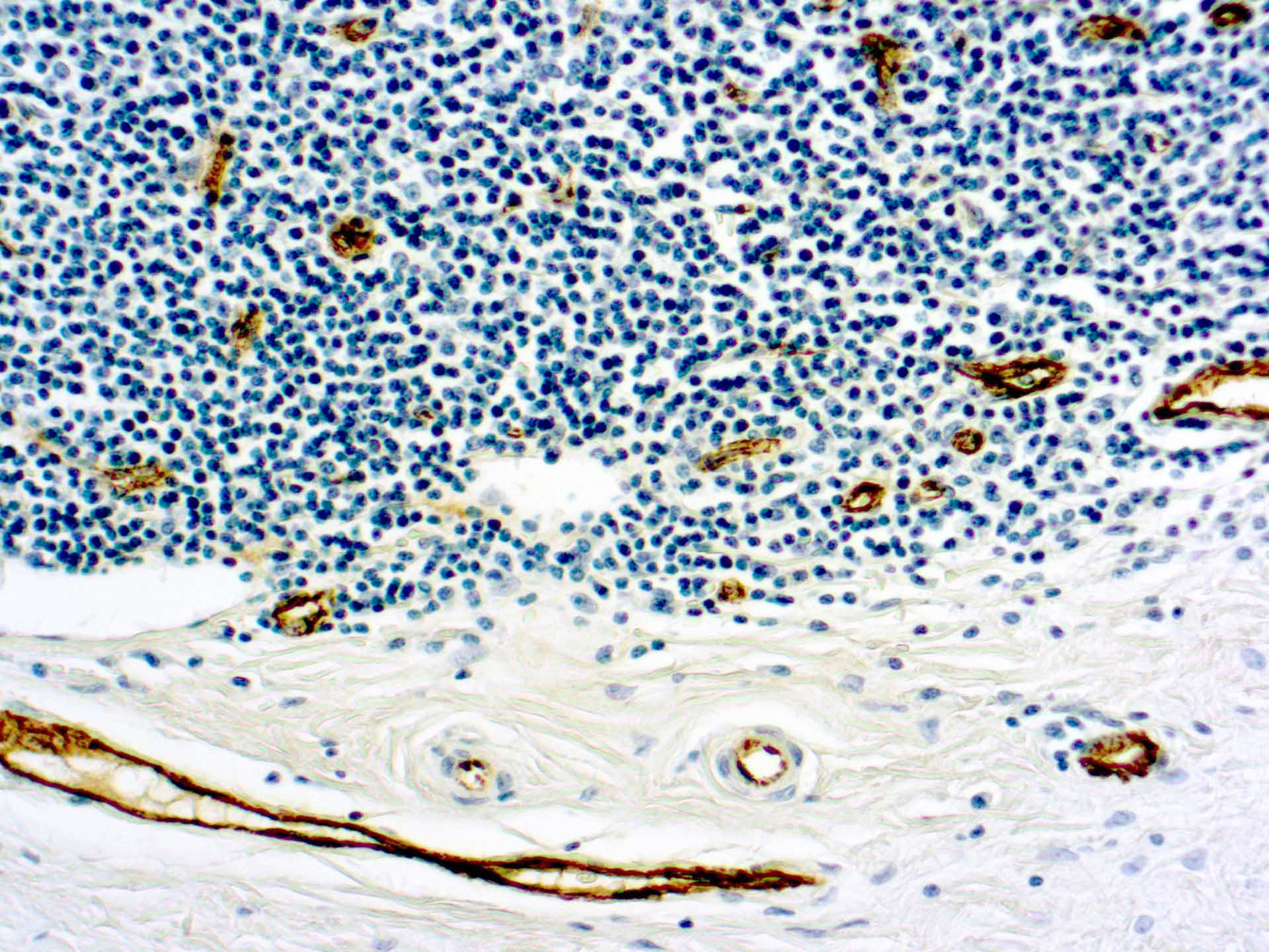 von Willebrand Factor (vWF) is a multimeric glycoprotein that is found in endothelial cells, plasma and platelets. It acts as a carrier protein for Factor VIII and promotes platelet adhesion and aggregation. vWF undergoes a variety of posttranslational modifications that influence the affinity and availability for Factor VIII, including cleavage of the propeptide and formation of N-terminal disulfide bonds. This antibody helps to establish the endothelial nature of some lesions of disputed histogenesis, e.g. Kaposi’s sarcoma and cardiact myxoma. It is widely used for differentiating vascular lesions from those of other tissue differentiation within a panel of other vascular markers although not all tumors of endothelial differentiation contian this antigen.