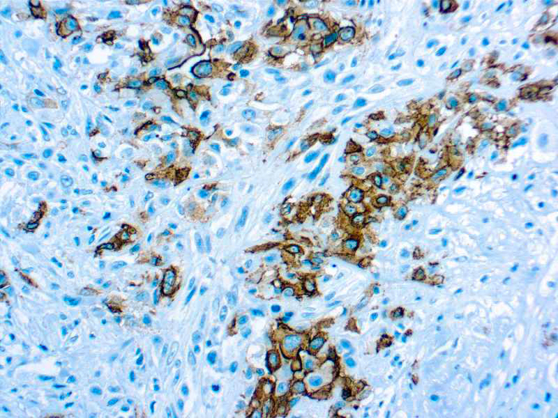 This antibody reacts with an unknown antigen on microvilli of mesothelioma cells. It stains normal mesothelial cells as well as epithelial mesotheliomas in a thick membrane pattern due to abundant lung microvilli on the surface of these cells.
