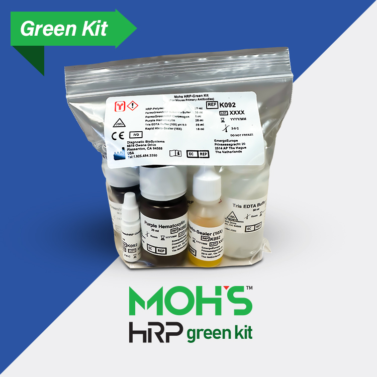 The Diagnostic BioSystems HRP-Green kit is designed for rapid IHC staining of frozen tissue sections and paraffin-embedded tissue sections. When the time to final results is critical, such as Mohs micrographic surgery, this Mohs HRP-Green Kit can provide reliable IHC results in less than 20 minutes. Specifically for frozen sections. This Mohs HRP-Green kit utilizes a permeabilization pretreatment step in a microwave oven, without boiling, This step has been shown to increase staining intensity compared with no permeabilization pretreatment. The clinical interpretation of any staining or its absence should be complemented by morphological studies using proper controls and should be evaluated within the context of the patient’s clinical history and other diagnostic tests and proper controls interpreted by a qualified pathologist and/or physician.