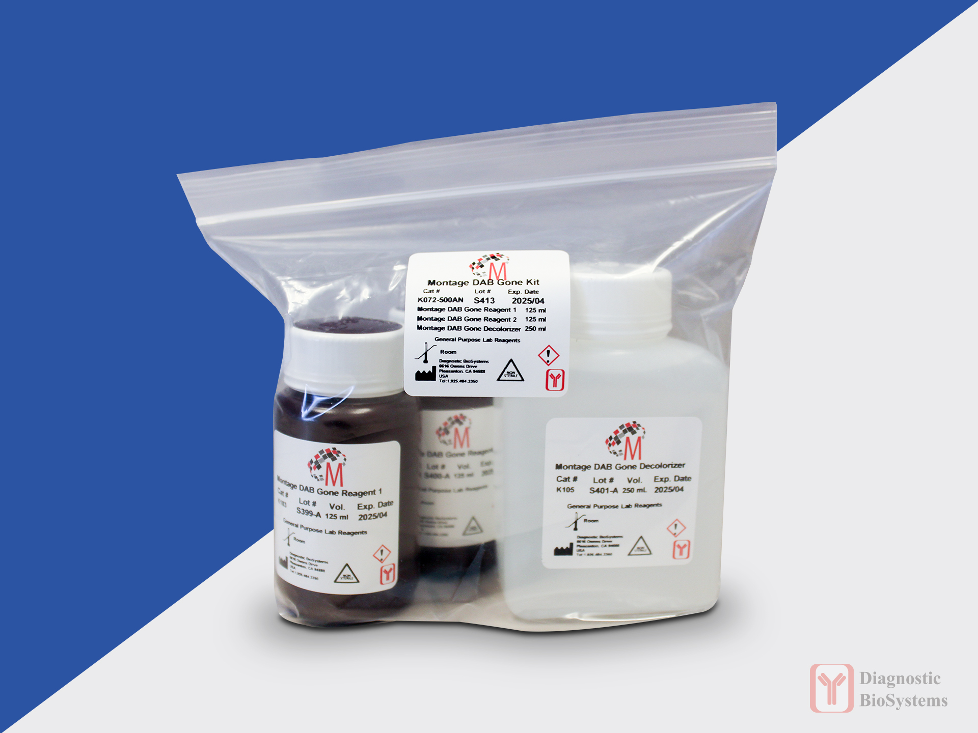 Montage DAB GoneTM removes diaminobenzidine (DAB) stains and precipitate from surfaces. Contamination with DAB residue can be a problem that may affect staining quality or automated immunohistochemistry stainers. Bleach will only reduce the color intensity of DAB stains, whereas,Montage DAB GoneTM removes the residual DAB stain that may clog instrument probes and tubing. This kit can also be used to clean glassware and other labware used in the lab that has been exposed to DAB and has retained DAB stains even after normal cleaning. It chemically reacts with DAB to inactivate the carcinogenic properties.