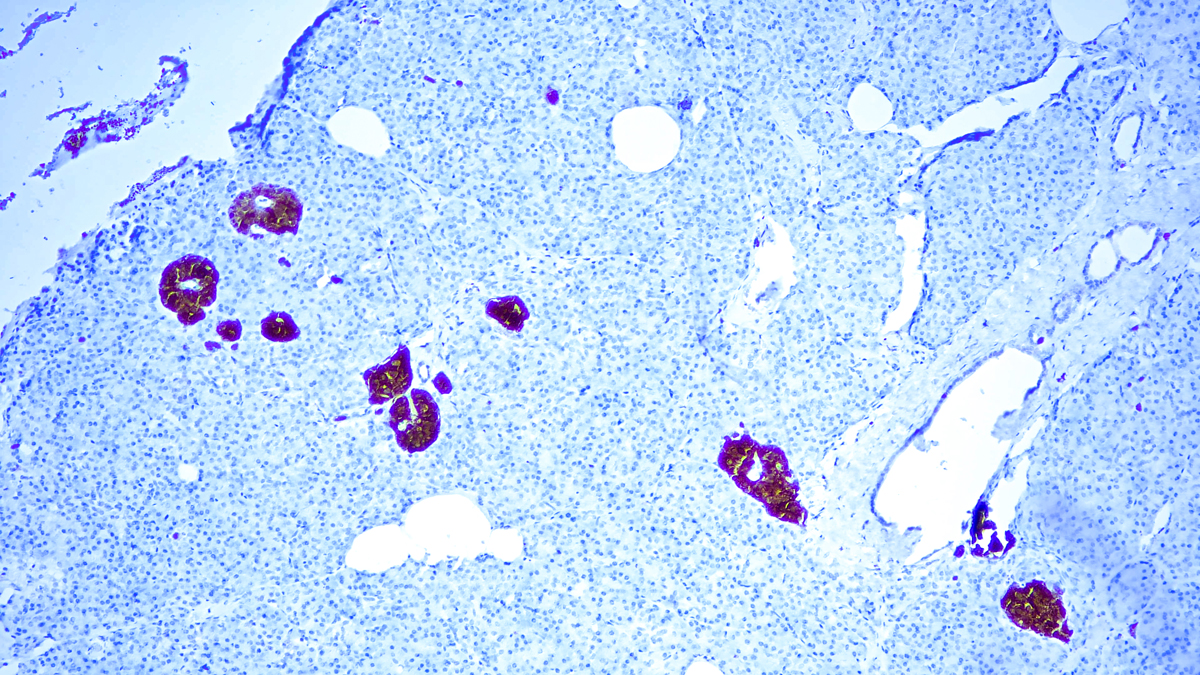 Three isoenzymes of enolases are identified, alpha, beta and gamma. Alphaisoform is expressed in most tissues, whereas beta-form is expressed predominantly in muscle tissue whereas gamma-enolase is found only in nervous tissue. These isoforms exist as both homodimers and heterodimers, and they play a role in converting phosphoglyceric acid to phosphenolpyruvic acid in the glycolytic pathway. NSE-gamma is a useful marker to identify peripheral nerves and tumors of neuro-endocrine origins, such as pheochromocytomas. It is usually employed in combination with other markers such as Synaptophysin, Chromogranin A, and Neurofilament.