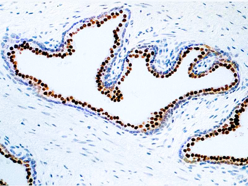 The homeodomain-containing transcription factor NKX3-1 is a putative prostate tumorsuppressorthatis expressed in a largely prostate-specific and androgen-regulated manner. Loss of NKX3-1 protein expression is a common finding in human prostate carcinomas and prostatic intraepithelial neoplasia.