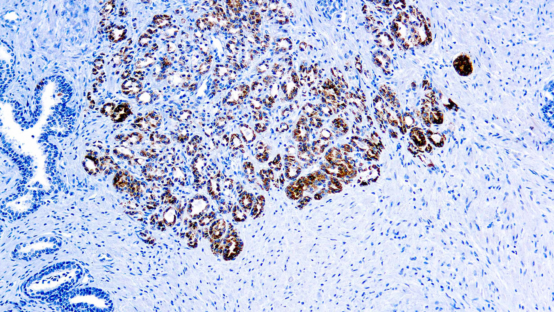 P504S (AMACR) is an essential enzyme in the β-oxidation of branched-chain fatty acids. Recently, P504S was identified through cDNA library subtraction and microarrays in malignant prostate tissues. High expression of P504S protein is found in prostatic adenocarcinoma but not in benign prostatic tissue by immunohistochemical staining in paraffin-embedded tissues. The expression of P504S is also detected in two premalignant lesions of the prostate: high-grade prostatic intraepithelial neoplasia (PIN) and atypical adenomatous hyperplasia. Using P504S as a positive marker along with basal cell staining (34 βE12 or P63) as a negative marker could help to confirm the diagnosis of small focus of prostate carcinoma on needle biopsy.