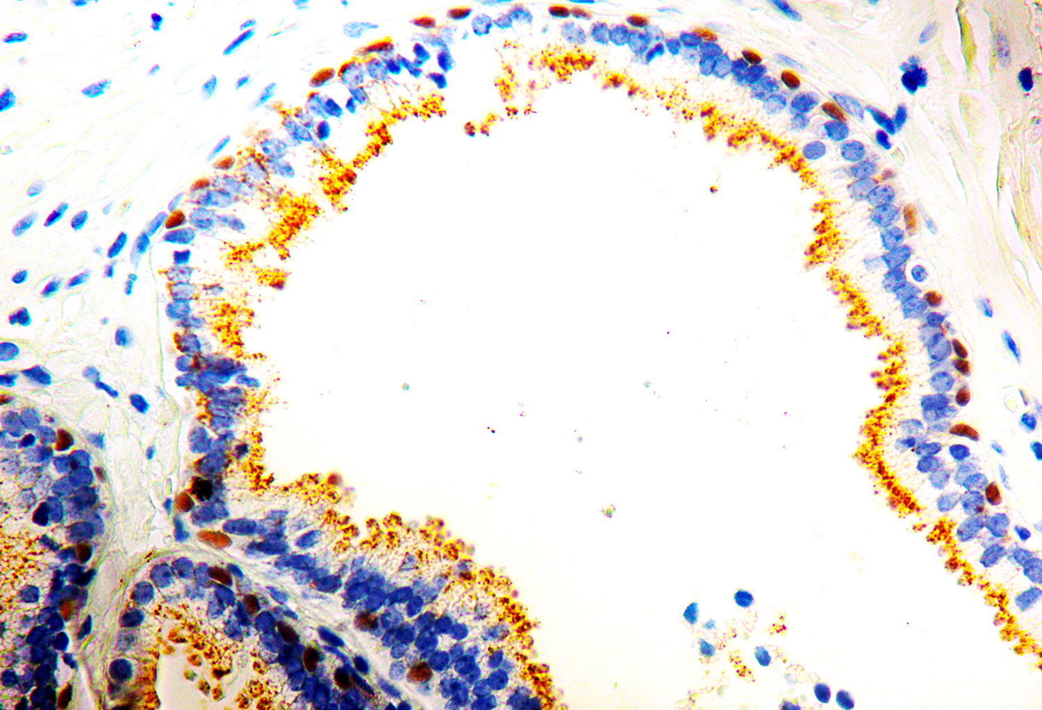 p63 is a homolog of the tumor suppressor p53. It is identified in basal cells in the epithelial layers of a variety of tissues, including epidermis, cervix, urothelium, breast and prostate. p63, vital for the development of the prostate and selectively expressed by normal prostate basal cells, has been shown useful in the differential diagnosis of benign prostatic lesions and prostatic carcinoma. p63 has also been shown to be highly sensitive and specific for detecting lung squamous cell carcinomas of the breast. p63 staining can be identified in myoepithelial cells of normal ducts. The expression of p504S protein is found in prostatic adenocarcinoma. It stains premalignant lesions of prostate: high-grade prostatic intraepithelial neoplasia