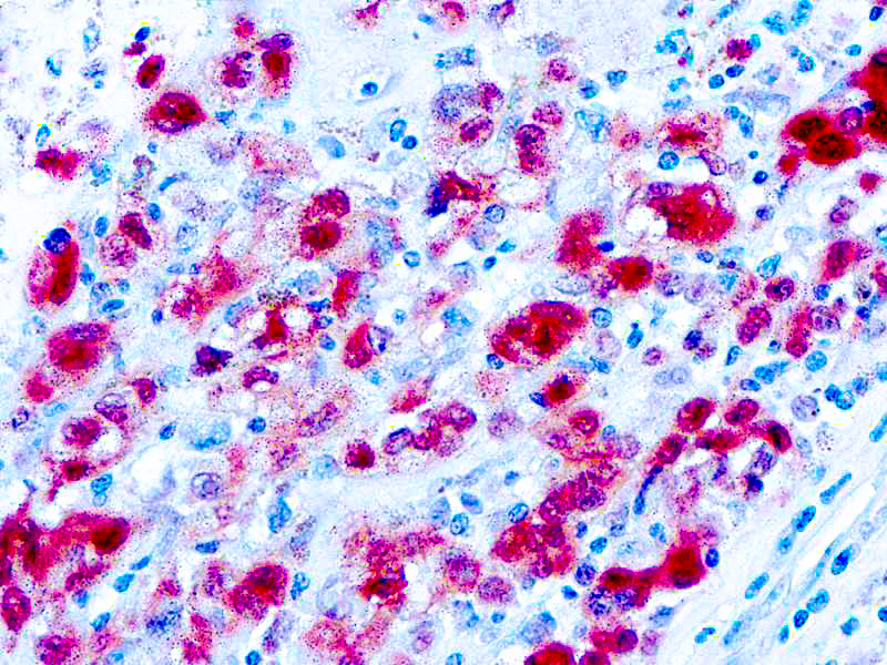 S100 belongs to the family of calcium binding proteins and S100A and S100B are two members of the S100 family. S100A is composed of an alpha and beta chain whereas S100B is composed of two beta chains. This antibody stains with S-100 protein. S-100 protein has been found in normal melanocytes, Langerhans cells, histiocytes, chondrocytes, lipocytes, skeletal and cardiac muscle, Schwann cells, epithelial and myoepithelial cells of the breast,salivary and sweat glands, as well as glial cells. A large number of welldifferentiated tumors of salivary gland, adipose and cartilaginous tissue, and Schwann cell-derived tumors express S-100 protein. Almost all malignant melanomas and cases of histiocytosis X are positive for S-100 protein. S100 is of great value in the identification of several neoplasms, particularly melanomas and their metastases.