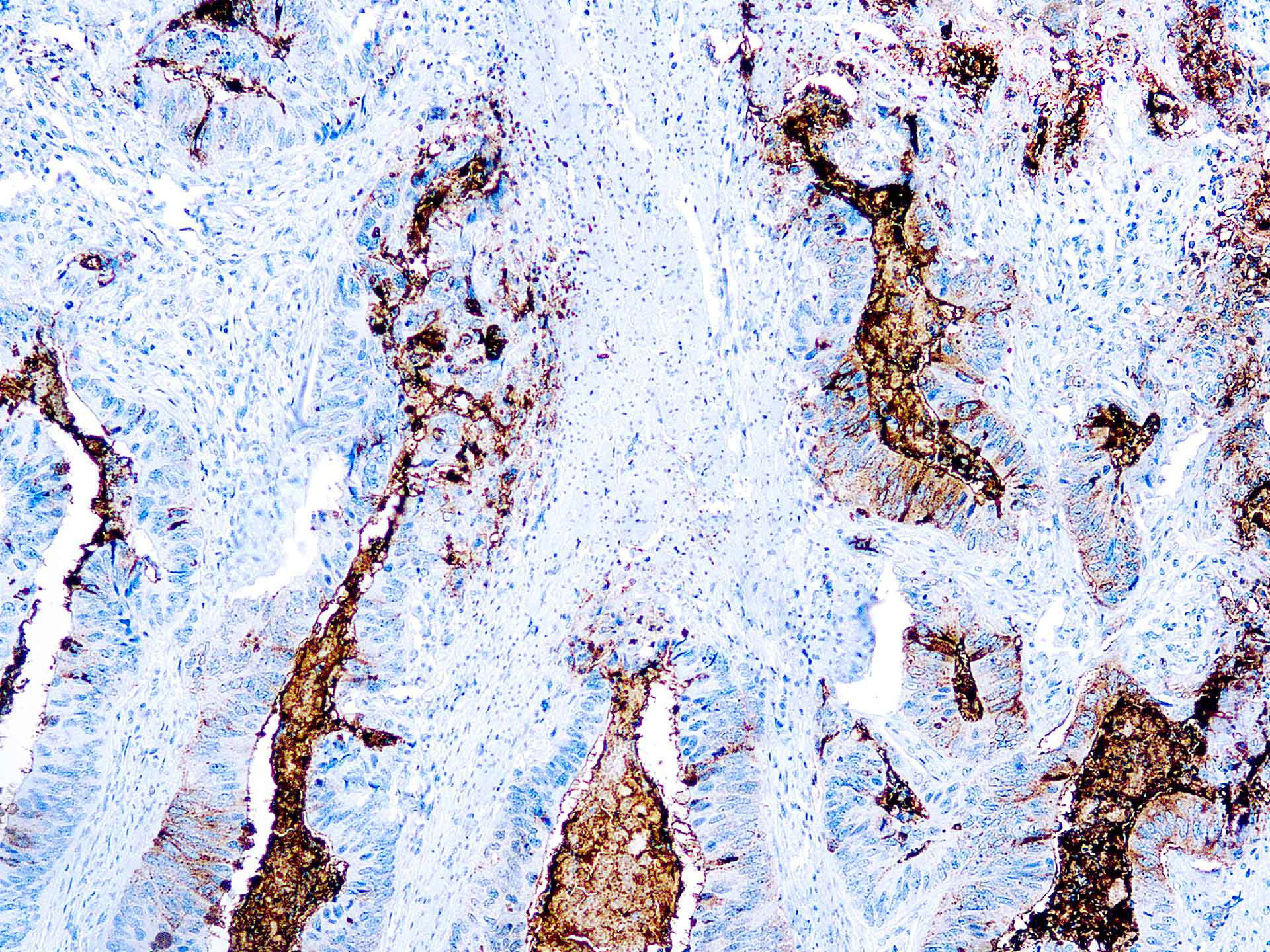 This antibody recognizes an oncofetal antigen of 220kDa, identified as a tumor-associated glycoprotein (TAG-72) with properties of a mucin. This antibody defined the mucin-carried sialylated-Tn epitope. TAG-72 is usually expressed by adenocarcinomas, but is negative in mesotheliomas. Studies have reported that this antibody has 80% sensitivity and 93% specificity for pulmonary adenocarcinoma. However, false positive reactions can occur so results must be interpreted with the utmost caution. This antibody may be useful in the differentiation of non-small cell carcinomas from small cell carcinomas of the lung. The combined use of anti-TAG-72 and anti-GCDFP15 is valuable in the diagnosis of apocrine carcinoma.